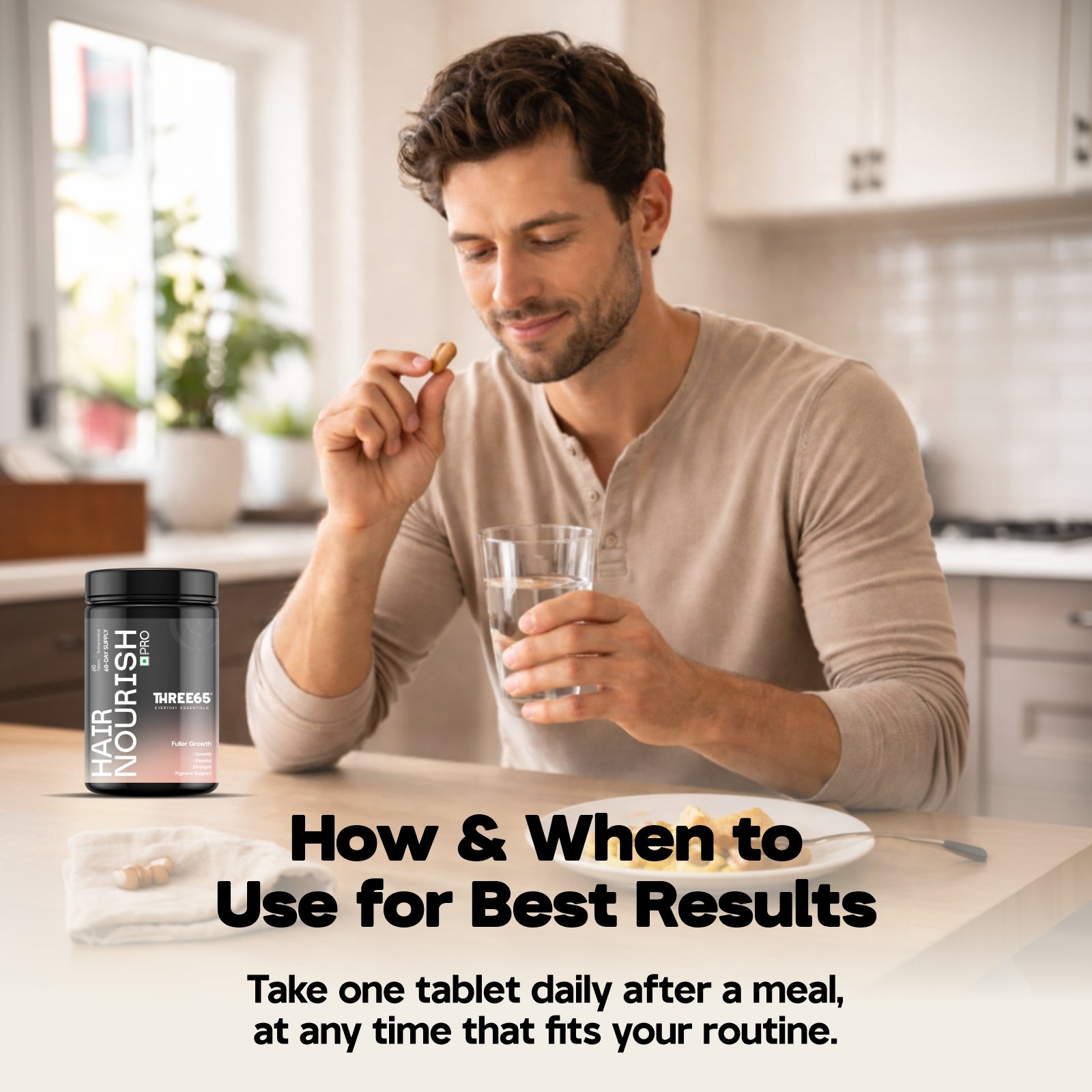 Three65 Hair Nourish Pro is precision-engineered to support multiple hair concerns simultaneously, promoting stronger growth, balanced pigmentation, improved density, and lasting shine.