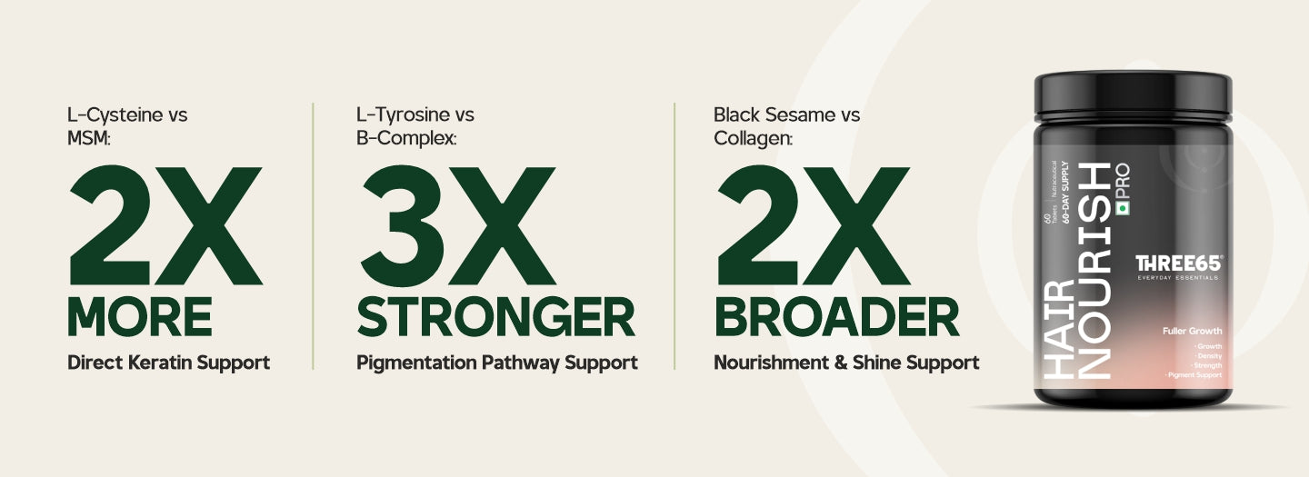 Three65 Hair Nourish Pro is engineered through amino acid precision and nutrient synergy to optimize keratin synthesis, preserve follicle integrity, and promote visible hair density.